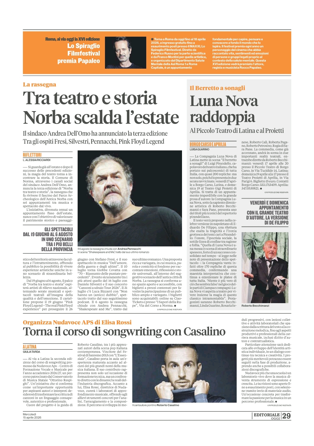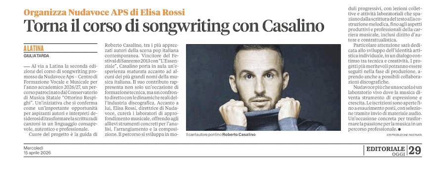 Corriere Pontino: A Latina torna il corso di songwriting di NUDAVOCE con Roberto Casalino